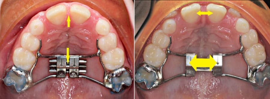 Palate/Maxillary Expansion: When your child’s upper jaw (maxilla) is too narrow in comparison with the lower jaw (mandible), it often leads to a crossbite, where the lower teeth sit outside the upper teeth. This can present on one side or both sides of the mouth. If left untreated, this can lead to jaw/facial asymmetry and severe crowding. A palate expander is a device that works best in younger children to help the deficient upper jaw expand, so that it will fit the lower jaw properly. Parents are instructed on how to turn/activate the expander daily. The turning typically lasts for about 1 month, followed by a 6 month holding period where the expander is not turned anymore. The expander is kept in to build stability. A significant space will appear between the top front teeth during proper expansion and is often beneficial to a crowded mouth. A limited/temporary set of top, front braces will often be placed for a few months after expansion, to close the gap created and to align the front teeth.